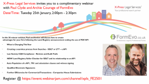 Join us on Tuesday 25 January at 2pm for a free webinar with Paul Clyde and Archie Courage of FormEvo. In this 30 minute webinar, Paul and Archie will discuss how to create advantages for your firm following the Land Registry announcement ending the use of PDF AP1s.
